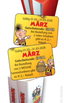Im Monat März gibt es für unsere Abonnenten je einen Leserclubkartengutschein für die MOSAIK-Sammelordner und unsere dazu passenden roten Schuber. Ein MOSAIK-Sammelordner schluckt einen ganzen Jahrgang Abrafaxe-Abenteuer und mitsamt der roten Schuber staubt eure MOSAIK-Sammlung nicht mehr ein. Mit euren Leserclubkartengutscheinen spart ihr je 2 Euro auf einen 2er-Pack! Die Einlösung lohnt sich also!Aber Achtung: Die Bestellung und Bezahlung muss noch im März erfolgen. Ihr habt also nur noch ein paar Tage Zeit. Direkt zum MOSAIK-Shop.