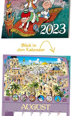 MOSAIK Kalender 2023Die Abrafaxe im Orient Kurzbeschreibung: Zwölf prächtige, orientalische Wimmelbilder aus der Welt von 1001 Nacht haben wir in diesem Kalender für euch zusammengestellt. In den über fünf Jahrzehnten Abrafaxe-Abenteuern waren Abrax, Brabax und Califax nämlich schon dreimal im Orient zu Gast und wurden stets verzaubert von der Vielfalt der Farben, Gerüche und Impressionen. Kommt mit auf diese magische Reise und taucht ein in das Getümmel! Aufhängung mittels LochbohrungFormat: 47 × 34 cm14 Seiten Direkt zum MOSAIK-Shop.