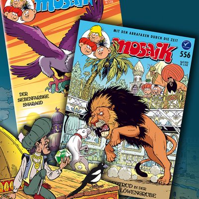 Unser aktuelles April-MOSAIK 556 mit den Abrafaxen im Orient ist seit dieser Woche am Kiosk erhältlich. Aber auch unsere Jubiläums-Ausgabe 555 des Vormonats, die jeweils eine persönliche Gewinnnummer enthält, könnt ihr noch im April im Presseregal finden. Solltet ihr es also bislang nicht geschafft haben, euch ein Exemplar zu sichern, um euer Glückslos auf einen Auftritt im MOSAIK einlösen zu können, dann nichts wie los! MOSAIK 555Der siebenfarbige Smaragd Direkt zum MOSAIK-Shop. MOSAIK 556Gertrud in der Löwengrube Direkt zum MOSAIK-Shop.